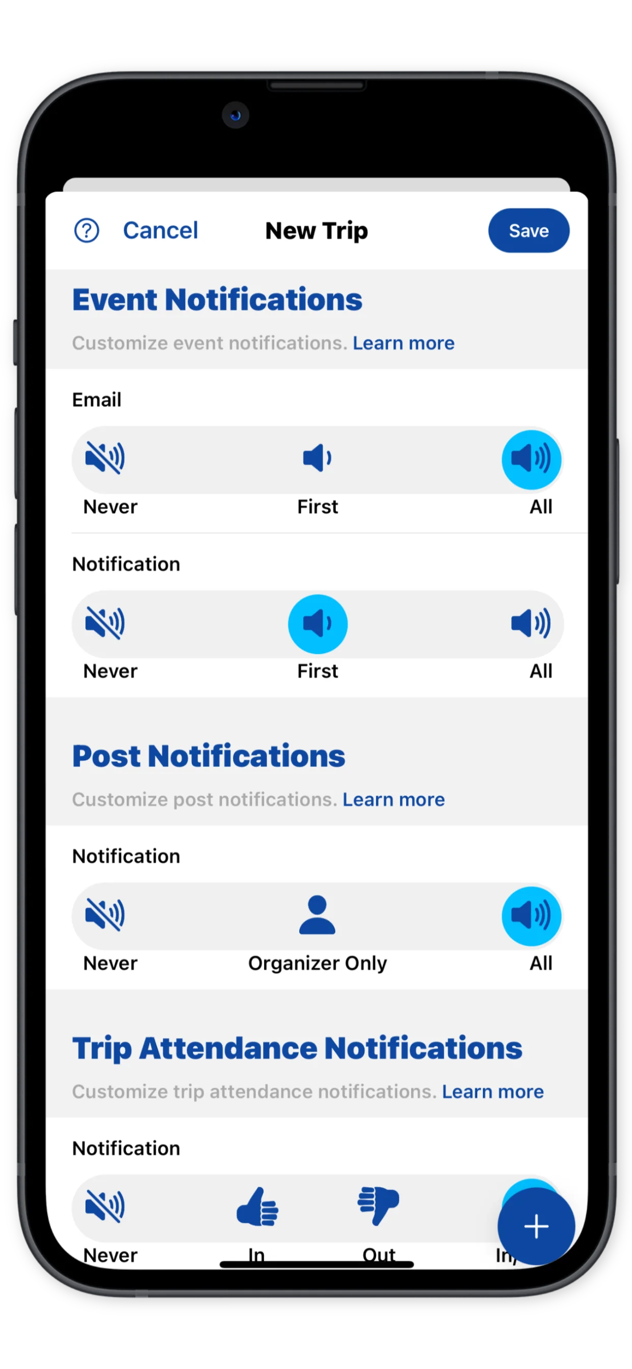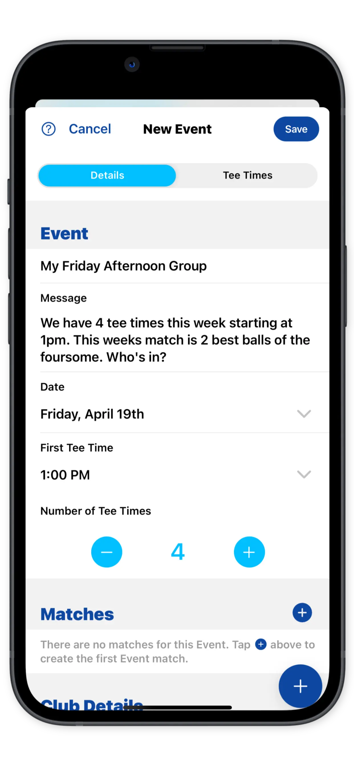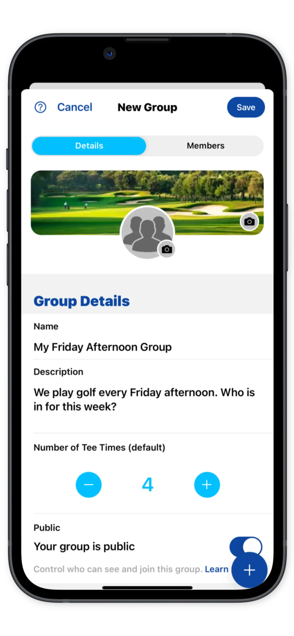 Create a new event to let your group know when and where you are golfing and what the game is. Group members can join the event using the app making it easy to keep track of who is playing.