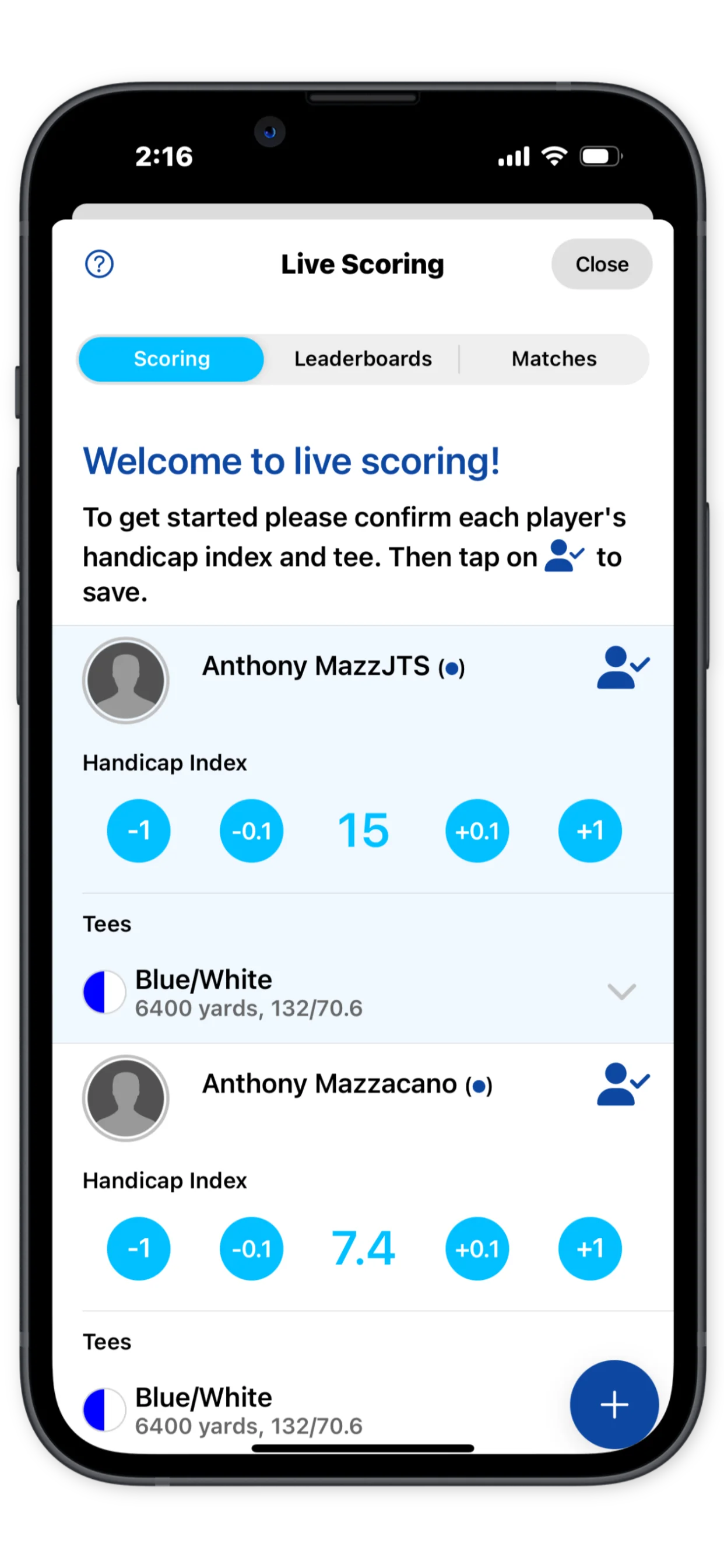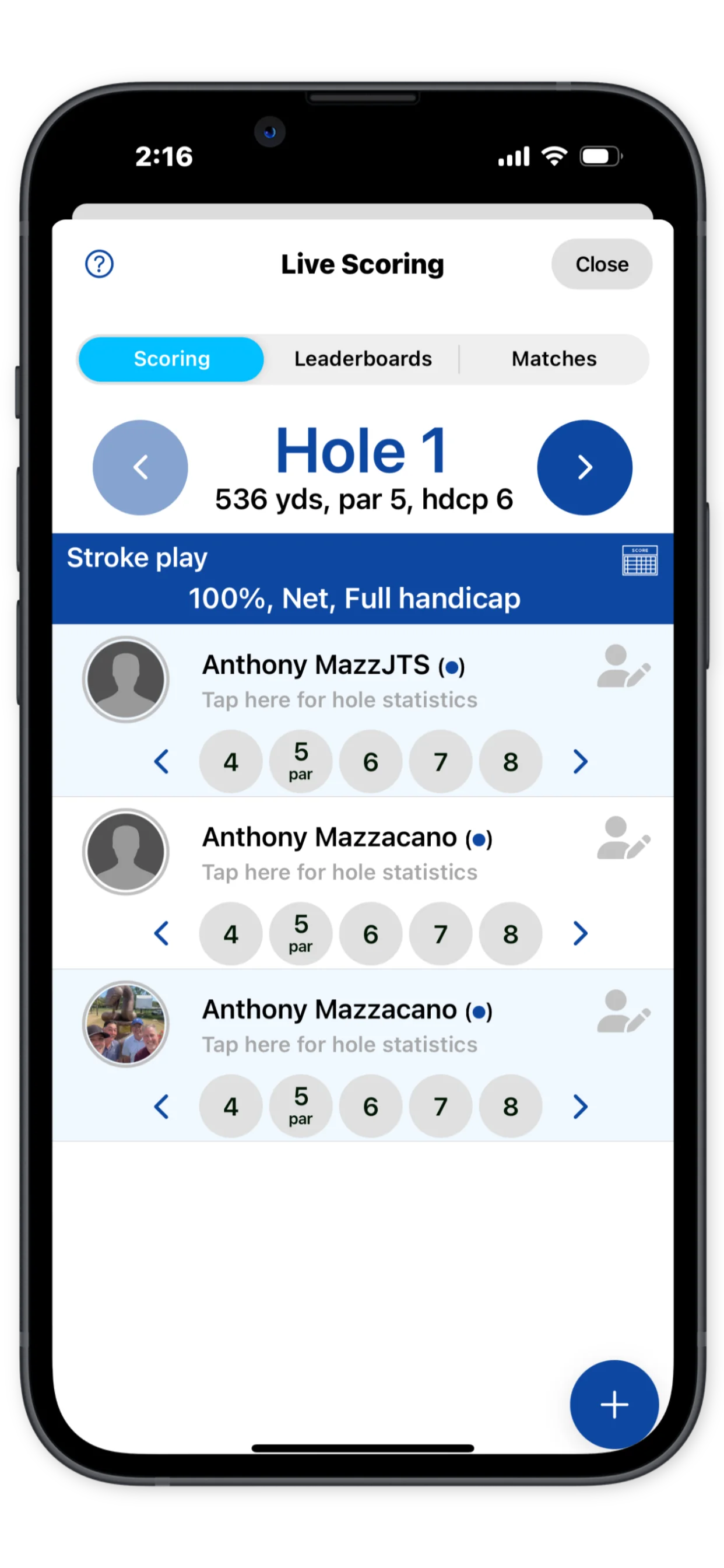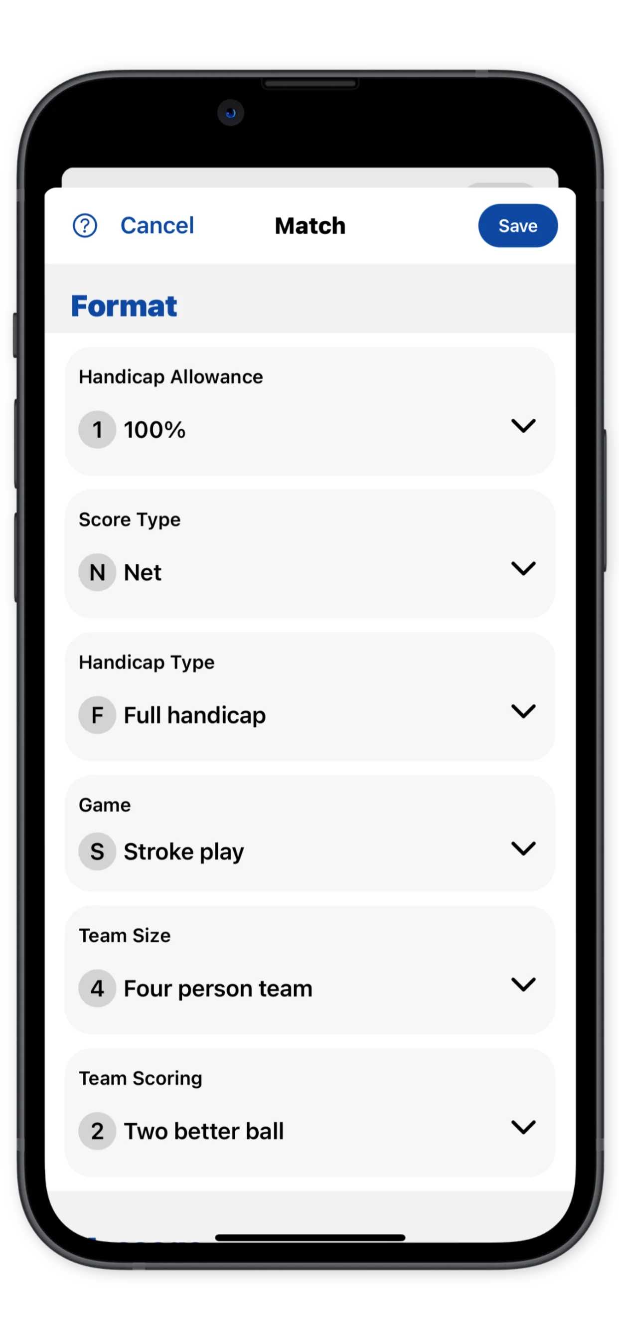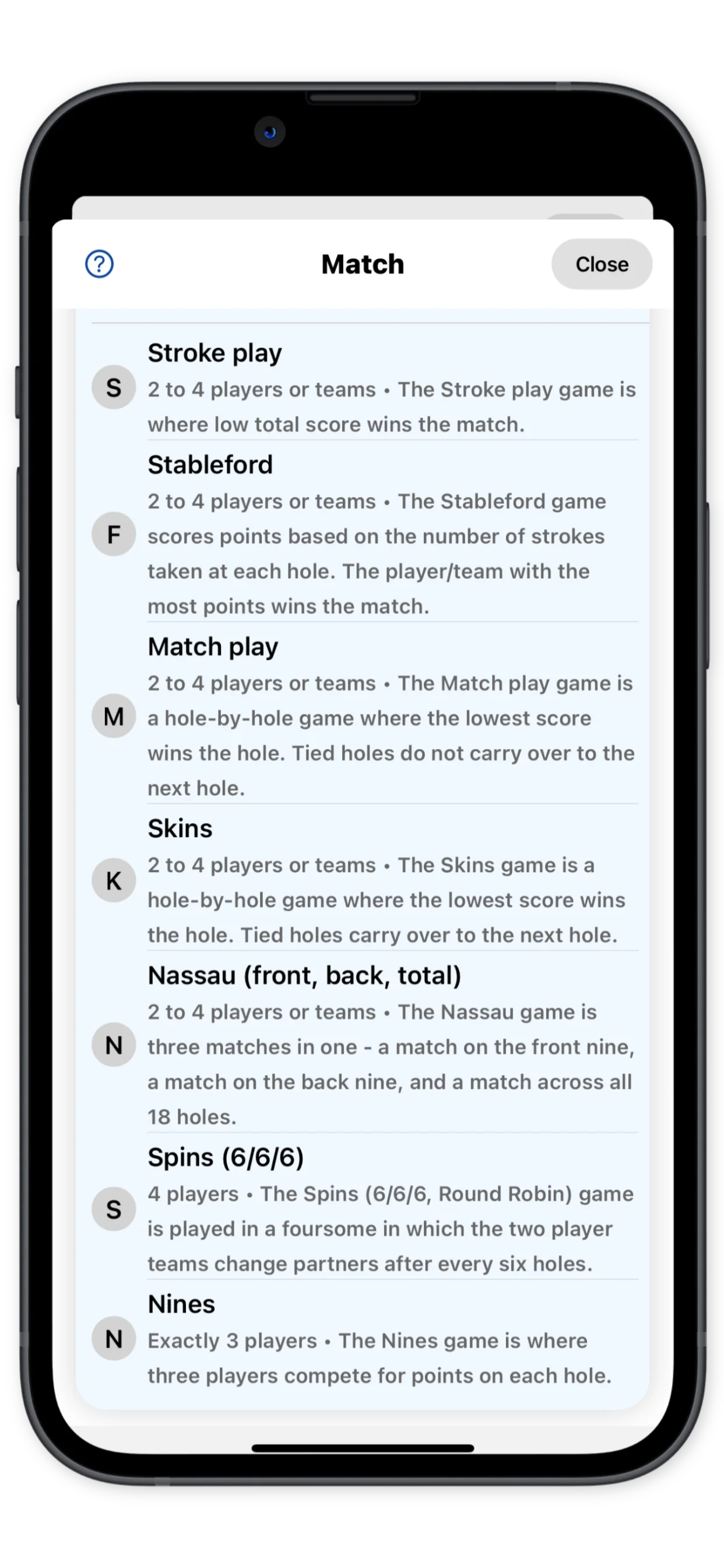 Create a big match for the entire group or create any number of small matches between your own playing partners. Choose from a list of games such as stroke play, match play, stableford, skins and more.
